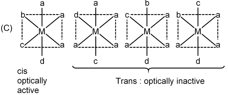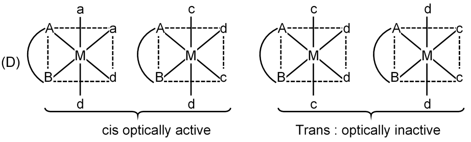 | (D) [M(AB)c2d2]n± | (S) 2 optically active isomers |