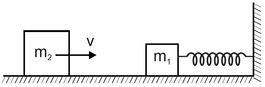 A block of mass m1 = 4kg at rest on a horizontal frictionless surface is connected to an unstretched spring with spring constant 500 N/m whose other end is fixed. A second block of mass m2 = 1kg whose speed is 10m/s collides with the first block.