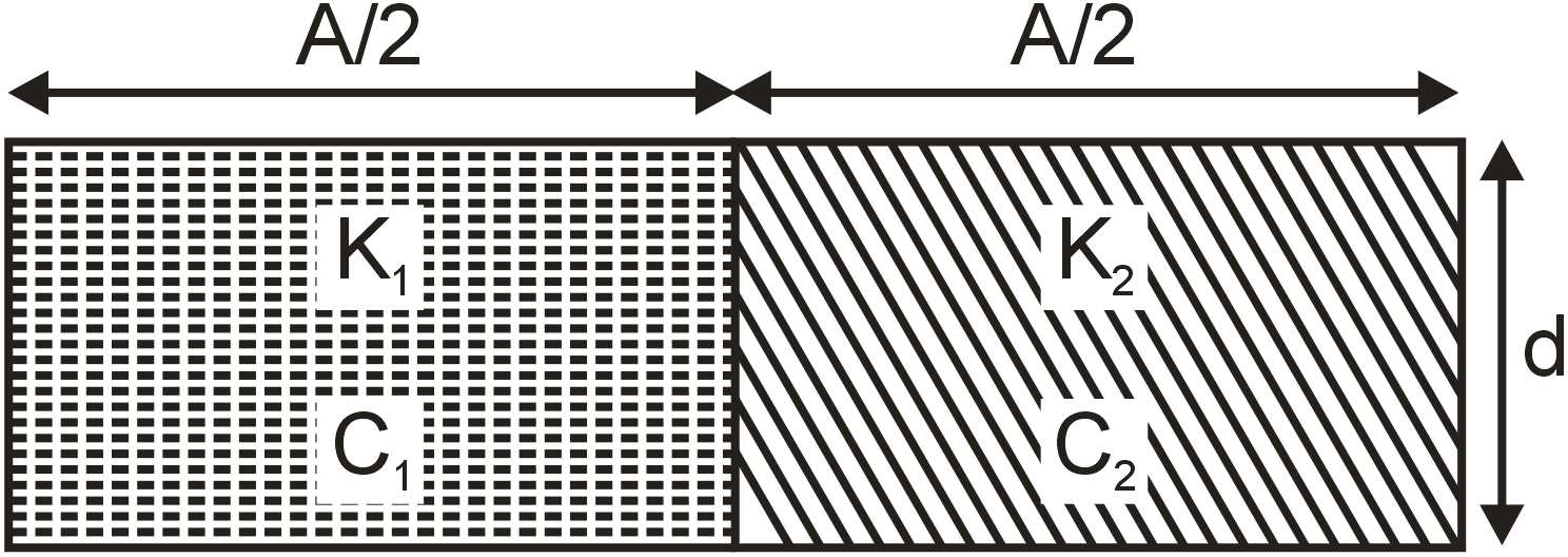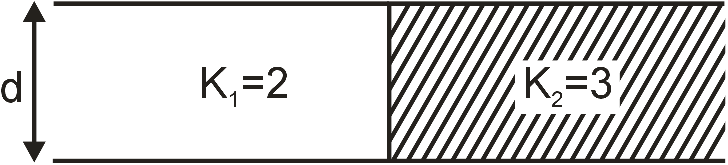 A capacitor of 10µF capacitance whose plates are separated by 10mm through air and each plate has area 4cm2 is now filled equally with two dielectric media of K1 = 2, K2 = 3 respectively as shown in figure. If new force between the plates is 8N. The supply voltage is ______V.