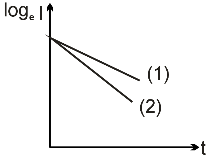 A graph between current & time during charging of a capacitor by a battery in series with a resistor is shown. The graphs are drawn for two circuits. R1, C1 and V1 are the values of resistance, capacitance and EMF of the cell in one circuit and R2, C2 and V2 for another circuit respectively. If only two parameters (out of resistance, capacitance, EMF) are different in the two circuits. What is the correct option?