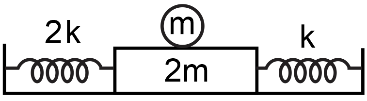 A long plank P is placed on a horizontal frictionless surface and connected to two springs of spring constant k and 2k respectively. A cylinder of mass m is placed on the plank. The plank is displaced towards right (positive direction) and released at t = 0 and it oscillates with amplitude A. The cylinder does not slip on the plank during the oscillation