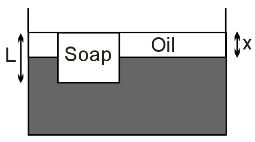 A rectangular bar of soap has density 800 kg/m3 floats in water of density 1000 kg/m3. Oil of density 300 kg/m3 is slowly added, forming a layer that does not mix with the water. When the top surface of the oil is at the some level as the top surface of the soap. What is the ratio of the oil layer thickness to the soap’s thickness, x/L?