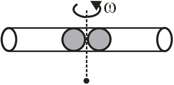 A smooth tube of certain mass containing two identical balls is rotated as shown in gravity free space and released. The two balls move towards ends of the tube. Which of the following quantity is not conserved.