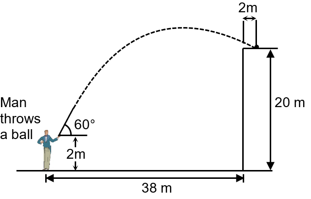 A soft ball is thrown at an angle of α = 60° above the horizontal. It lands a distance d = 2m from the edge of a flat roof, whose height is h = 20 m ; the edge of the roof is ℓ = 38 m from the thrower (see fig.). At what speed (in m/s) was the softball thrown?