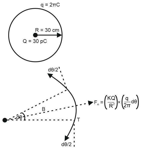 A thin metallic wire having cross sectional area of 10–4m2 is used to make a ring of radius 30 cm. A positive charge of 2πC is uniformly distributed over the ring, while another positive charge of 30 pC is kept at the centre of the ring. The tension in the ring is –––––– N ; provided that the ring does not get deformed (neglect the influence of gravity).