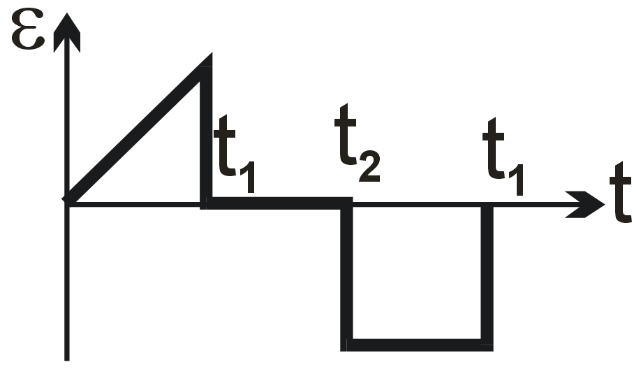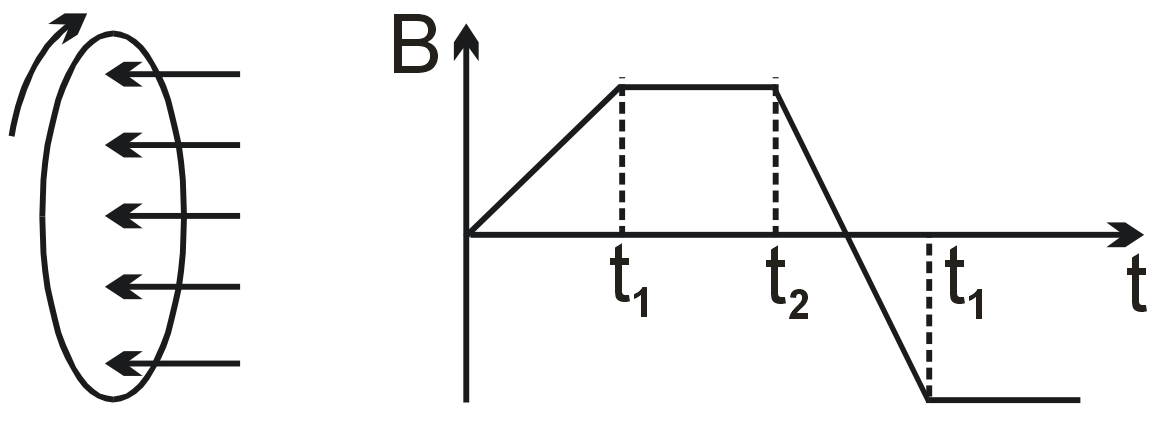 The given B-t graph has constant slopes. For 0 to T/2: dB/dt is positive and constant, so ε is negative (constant). For T/2 to T: dB/dt is negative and constant, so ε is positive (constant). The magnitude is the same in both intervals due to equal slope magnitudes.