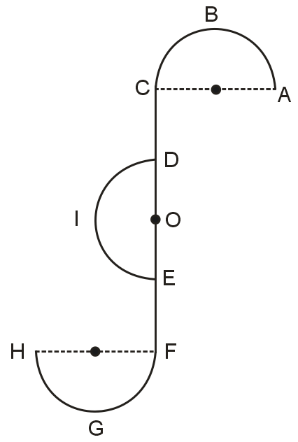 A wireframe is made of a wire of uniform cross-section which is shown in figure. ABC, HGF and DIE are semicircular arcs of radius r. CD = DO = OE = EF = r and 'O' is the centre of circle. Then centre of mass of frame is :