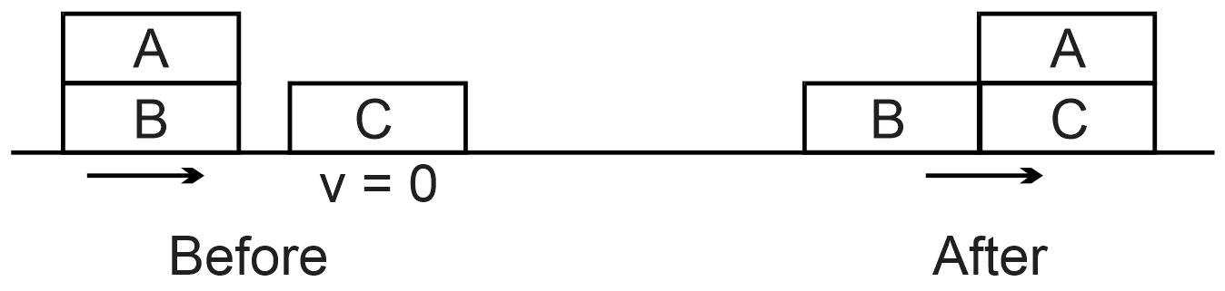 Board A is placed on board B as shown. Both boards slide, without moving with respect to each other, along a frictionless horizontal surface at a speed 6 m/s. Board B hits a resulting board C "head-on". After the collision, boards B and C stick together and board A slides on top of board C and stops its motion relative to C in the position shown on the diagram. What is the length (in m) of each board? All three boards have the same mass, size and shape. The coefficient of kinetic friction between boards A and C and between boards A & B is 0.3.