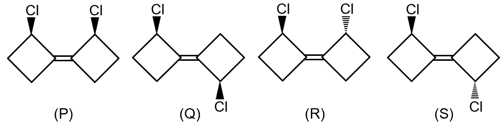 The compounds are geometric isomers due to restricted rotation around double bonds. They are configurational isomers as their spatial arrangement differs and can only be changed by breaking bonds. However, they are not all optical isomers; only Q and R are chiral (asymmetric carbons) and resolvable into enantiomers. S is achiral (meso compound) and not resolvable.
