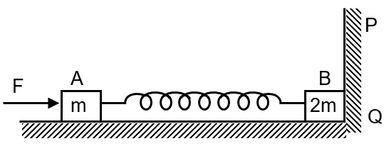 Figure shows a system of two blocks connected by a spring, kept on a frictionless surface. Block A is in equilibrium. Suddenly supporting vertical wall PQ is removed.