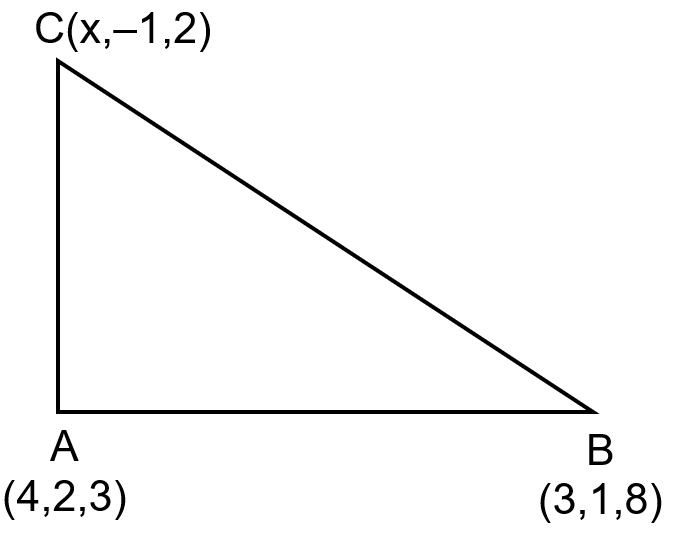 Find x if ΔABC is right-angled at A where A ≡ (4,2,3), B ≡ (3,1,8), C ≡ (x,−1,2).