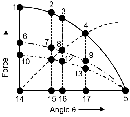 Given graph is a plot of magnitude of normal, limiting friction, kinetic friction and static frction versus angle of inclination θ for the coin lying on book. 17 points are labeled with numbers. The coin slips at a certain angle θc. The coefficient of static friction is 0.6, and the coefficient of kinetic friction is 0.4. First consider the range of θ for which the coin is stationary. Which points of the curves can represent