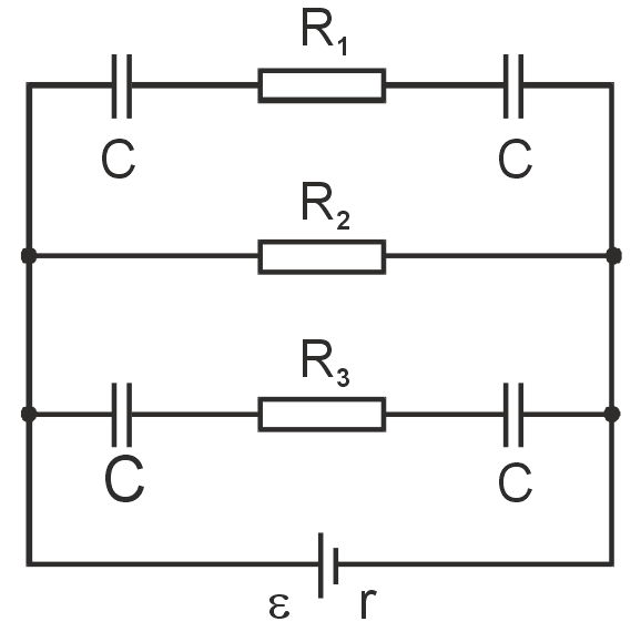 In the circuit (fig.), ε = 5V, r = 1 ohm, R1 = R3 = 4 ohms, R2 = 3 ohms and C = 3μF. Find the charge on the plates of each capacitor.