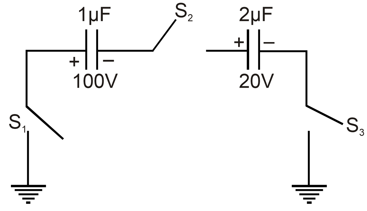 In the circuit shown, two capacitors C1 and C2 are charged to a potential difference of V1 and V2 separately. After charging switches S1, S2 and S3 are closed. Calculate the charge (in µC) passed through switch S1. Take capacitance C1 = 1µF, C2 = 2µF and their respectively potential difference V1 = 100 V and V2 = 20 V.