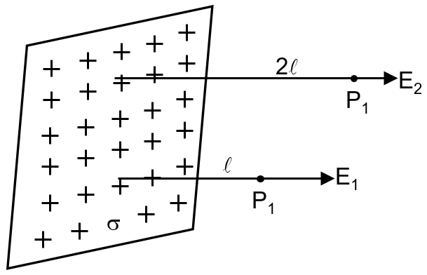 In the figure a very large plane sheet of positive charge is shown. P1 and P2 are two points at distance ℓ and 2ℓ from the charge distribution. If σ is the surface charge density, then the magnitude of electric fields E1 at E2 at P1 and P2 respectively are: