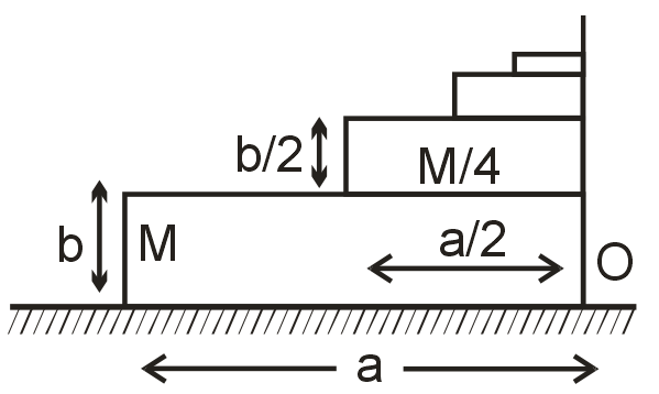 Infinite number of bricks are placed one over succeeding brick having half the length and breadth of its preceding bricks and the mass of each succeeding bricks being (1/4)th of the preceding one. Taking O as the origin, the x coordinate of centre of mass of the system of bricks is [Take positive x-axis towards right from the origin O.]