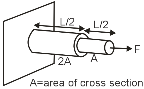 The bar shown in the figure is made of a single piece of material. It is fixed at one end. It consists of two segments of equal length but different cross-sectional area A and 2A. What is the change in length of the entire system under the action of an axial force F. Consider the shape of joint to remain circular. (Given : y is young's modulus).