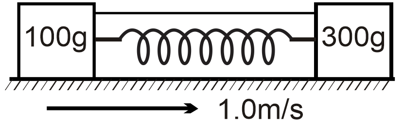 The carts in figure are sliding to the right at 1.0 m/s on a smooth level ground. The spring between them has a spring constant of 120 N/m and is compressed 40 cm. The carts slide past a flame that burns through the string holding them together. The carts are not attached to the spring. Afterward, what is the speed (in m/s) of 300g cart after it loses contact with the spring.