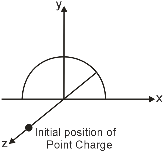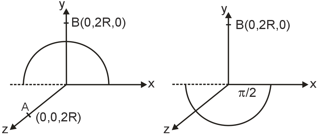 The diagram shows a semicircular ring carrying uniformly distributed charge +2μC on it. The radius of the ring is 4cm. A point charge +2μC is taken slowly from the point (0, 0, 8cm) to (0, 8cm, 0). The magnitude of work done is equal to 4J. After fixing the charge at its new position, the ring is rotated in anticlockwise sense about the X-axis as seen from (16cm, 0, 0) by an angle π/2. What is the magnitude of work done by electric field during the rotation of the ring?