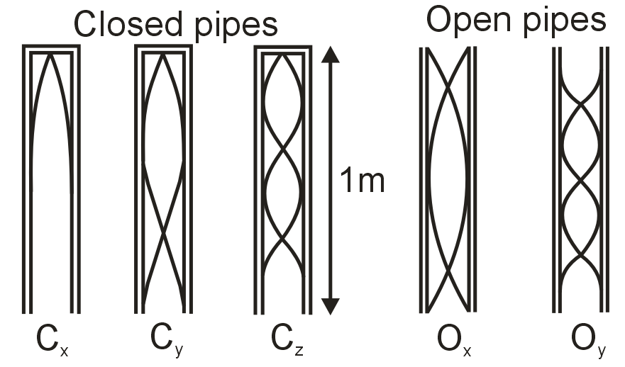 The figure represents five different standing sound waves set up inside of a set of organ pipes 1m long.