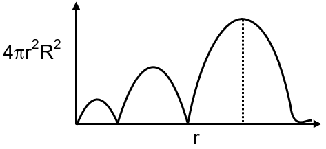 The radial charge density, , for a 3s orbital has two radial nodes where the probability is zero. The graph starts at the origin, rises to a maximum, falls to zero (first node), rises to a second smaller maximum, falls to zero again (second node), and then has a final, small rise before decaying asymptotically to zero. The correct graph is the one with two distinct points where the curve touches the x-axis (r).