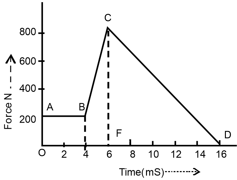 The magnitude of the force (in Newton) acting on a body varies with time t (in milliseconds) as shown in the figure. AB, BC and CD are straight line segments. The magnitude of the total impulse of the force on the body from t = 4 ms to t= 16 ms is ____ Ns.
