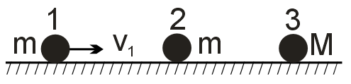 Two balls marked 1 and 2 of the same mass m and a third ball marked 3 of mass M are arranged over a smooth horizontal surface as shown in figure. Ball 1 moves with a velocity v1 towards ball 2 and 3. All collisions are assumed to be elastic.
