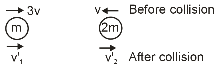 pi = pf ⟹ m × 3v – 2m × v = mv1' + 2mv2'