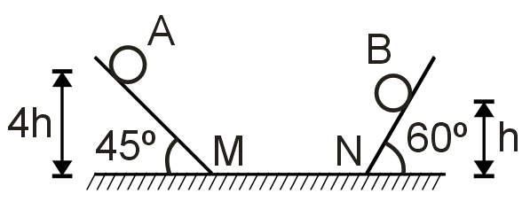 Two identical balls A and B are released from the positions shown in figure. They collide elastically on horizontal portion MN. All surfaces are smooth. The ratio of heights attained by A and B after collision will be(Neglect energy loss at M & N)