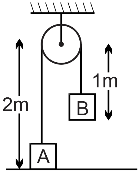 Two masses A & B each of 5 kg are suspended by a light inextensible string passing over a smooth massless pulley such that mass A rest on smooth table & B is held at the position shown. Mass B is now gently lifted up to the pulley and allowed to fall from rest. Determine up to what height will A rise for the ensuing