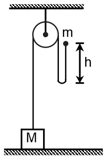 Two masses M and m are tied with a string and arranged as shown. What is the velocity (in m/s) of block M when it loses the contact with the ground ? m = 1 kg and M = 2kg. h = 90 cm.
